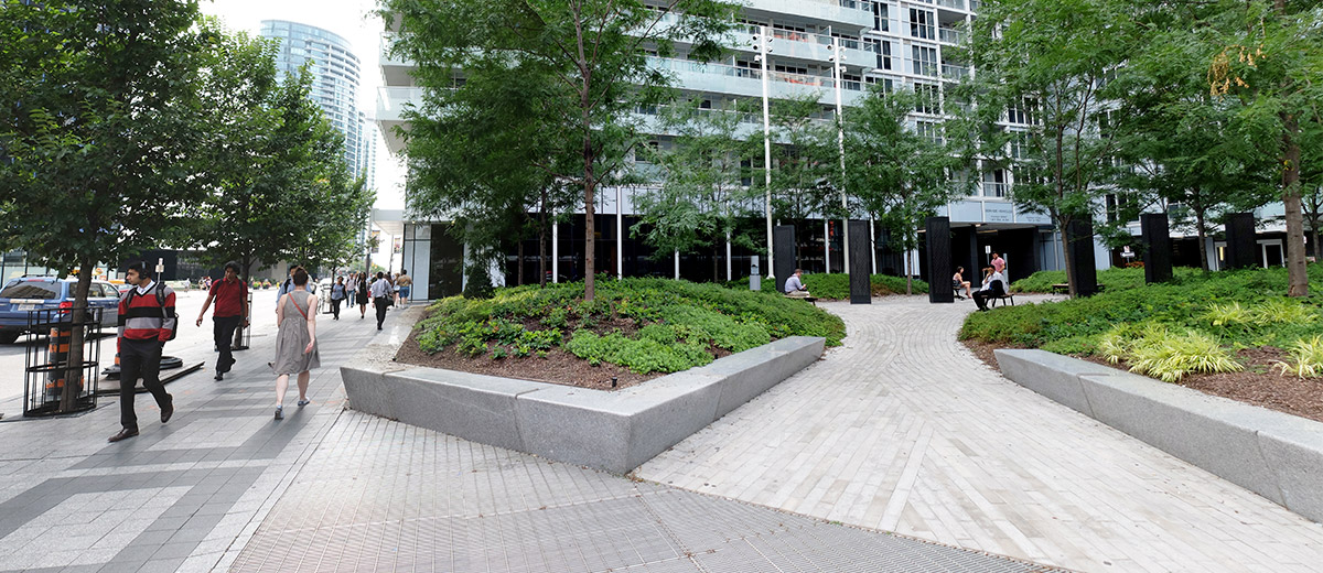 Panoramic view of Toronto’s 300 Front St. Public Garden at street level, CC+A