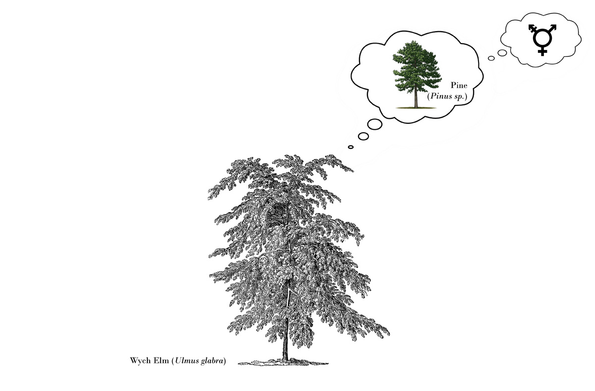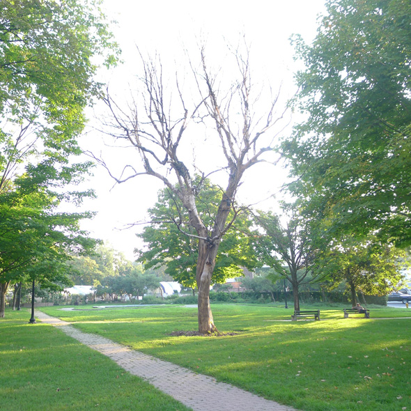 Green plastic balls, colour-matched to the surrounding summer foliage, were to be used to saturate the entire tree branch structure and dissolve the lifeless tree into the surrounding leafy canopy. As the other trees changed into fall colours, the ‘Wych Pine’ would remain defiantly green throughout winter and into spring, when it would again disappear and become one with the other trees. During the following summer, the tree was to have been discretely replaced by an Eastern White Pine, marking the end of the transitioning process from an elm into a real evergreen.