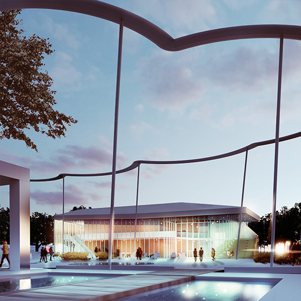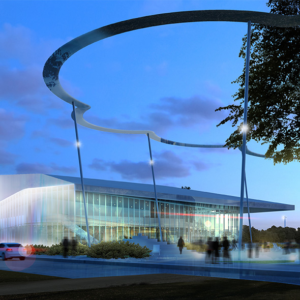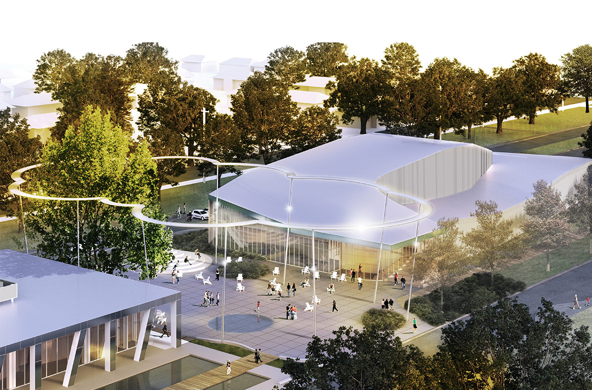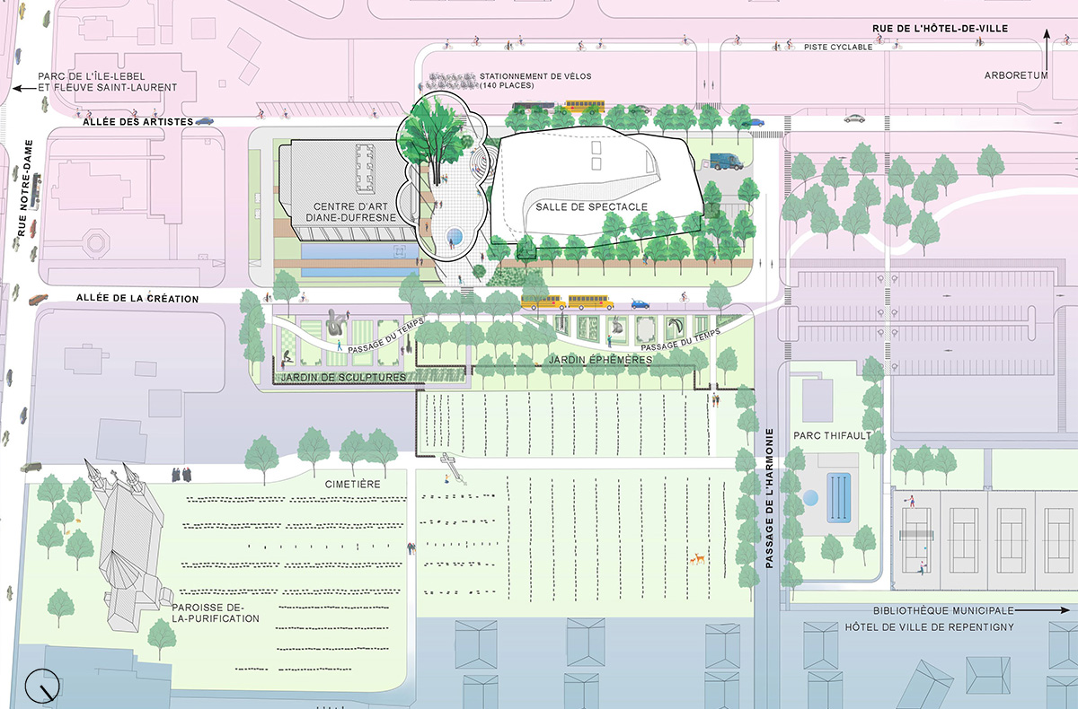 Our proposal for the Repentigny Performing Art Centre landscape and public plaza addresses the different functional components set out by the City, while creating a highly visible link between the facilities of the new cultural space. Placing it– in a strong and subtle way –  amid its urban context. Located in the heart of a large urban park, the site is bounded by Ile Lebel park and the St. Lawrence River to the East, the Thifaut Park sports centre to the West, and a church and cemetery to the North, where an existing cross is in position with the axis of the future plaza.