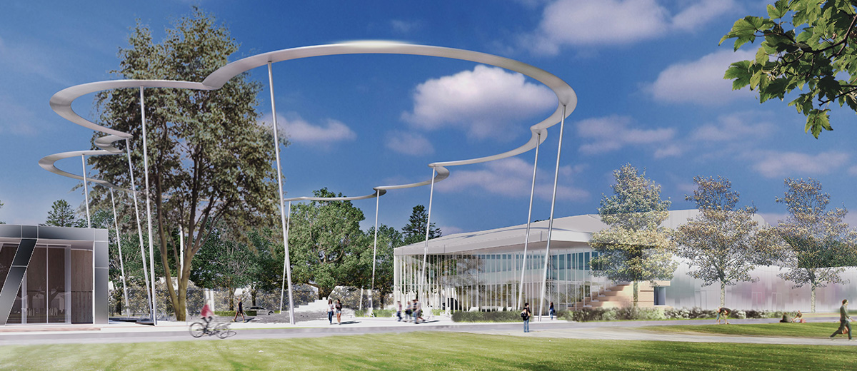 The main feature of the proposal is a “cloud”; a 14 metre mirror polished stainless-steel structure made up of a thin blade, supported by thin columns placed on the perimeter of the plaza. Slightly overlapping the roofs of the Diane Dufresne Art Centre and Performing Arts building, this elevated hoop unifies the buildings of this new cultural centre. Light and reflective, open and unifying, the cloud gives the impression of disappearing into the sky. Its strong presence becomes an iconic and central element for the landscape, a landmark for this area of Repentigny. The “cloud” brings additional value to the site and allows the public space to function beyond its mere programmatic elements. The plaza responds to the organic form of the cloud with an esplanade of white paving stones, circular steps for seating, a large shallow circular pool which both fills and drains according to weather conditions and programmed events, a grove of silver maples with serrated foliage, and three shrub mounds. The entire plaza becomes a soft, versatile, and comfortable space reinforced by the presence of flexible furniture.