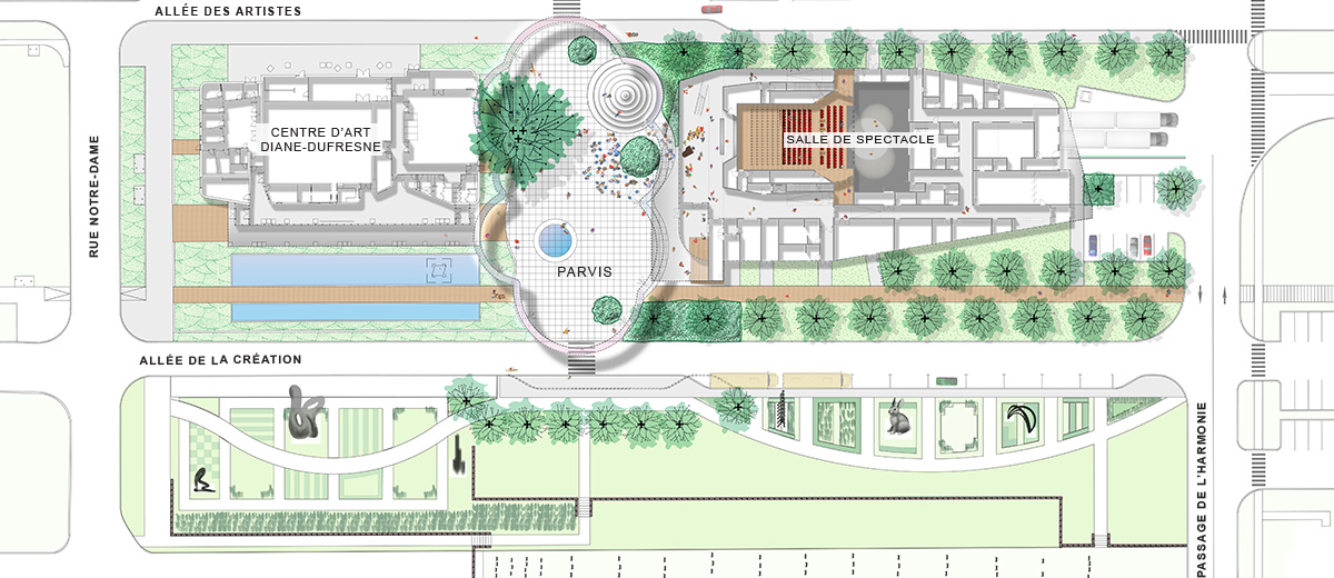 The landscape proposal continues to the North of the plaza. The existing sidewalk along the Diane Dufresne Art Centre is extended along the new Performing Art Centre and planted with trees, allowing this new facility to blend into the larger park.