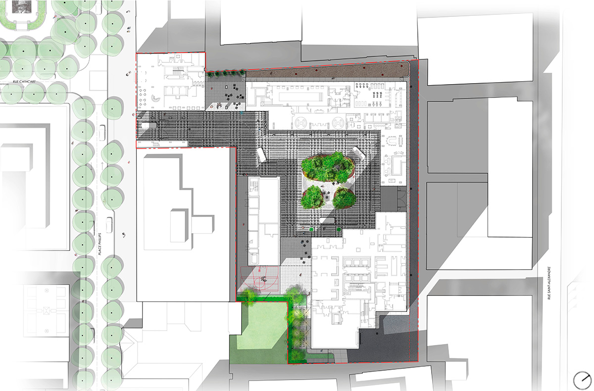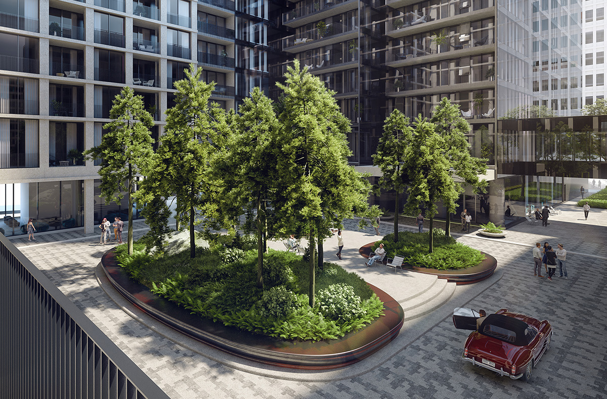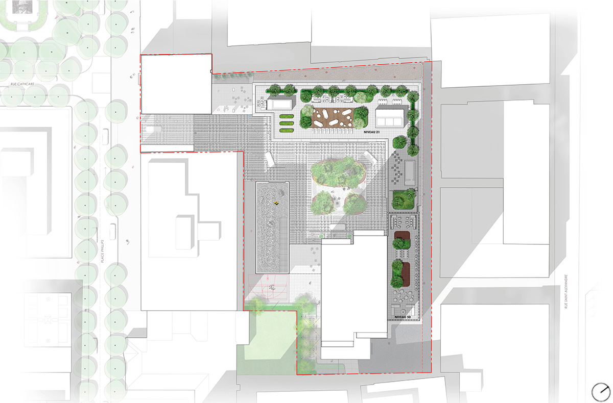 Le paysage amène à la création d’un ensemble résidentiel unique, accueillant et rassemblant les trois tours via l’utilisation d’un revêtement de sol continu dessinant un motif « Prince de Galles » tant sur les voies véhiculaires que les trottoirs. Clin d’œil à l’histoire du lieu, ce tissage célèbre est utilisé ici en référence au roi Édouard VII dont la statue monumentale trône au milieu du square Phillips adjacent. Homme de goût qui prisait l’art vestimentaire, Édouard VII a en effet popularisé de nombreux codes et motifs inspirés de la tradition anglaise, notamment le célèbre « Prince de Galles ». Grâce à l’utilisation de pavés contrastés entrecroisés, le sol se mue en une véritable étoffe reliant l’accès principal, situé rue square Philips, à l’apaisante cour intérieure composée de trois vases à bonsaï surdimensionnés. Leurs plantations évoquent un véritable morceau de forêt en ville, et ensemble ils forment un petit jardin accessible qu’il sera possible d’apprécier tant de l’intérieur que depuis les bâtiments avoisinants. D’autres espaces, tels qu’un parc canin, une terrasse café, une aire pour pratiquer certains sports tels que le basketball et un espace avec des BBQ, sont aussi planifiés au rez-de-chaussée afin de rendre la vie des résidents stimulante et pratique.