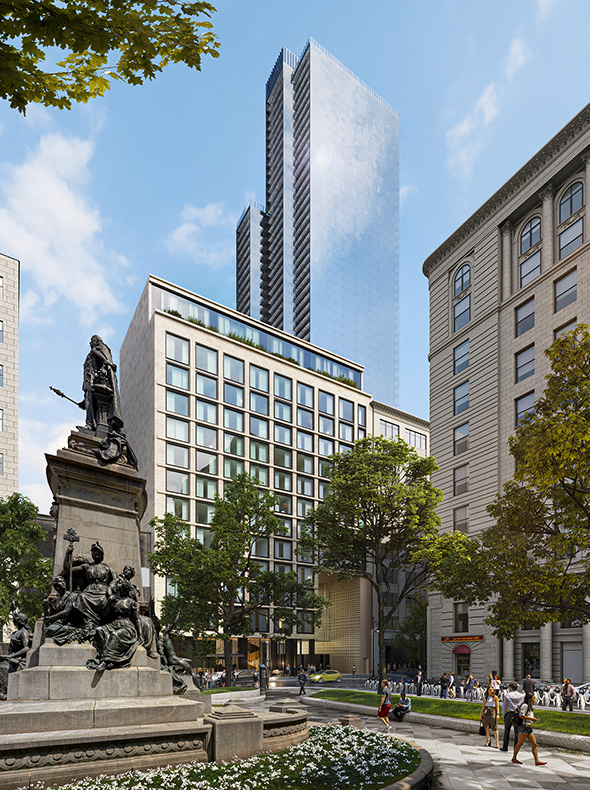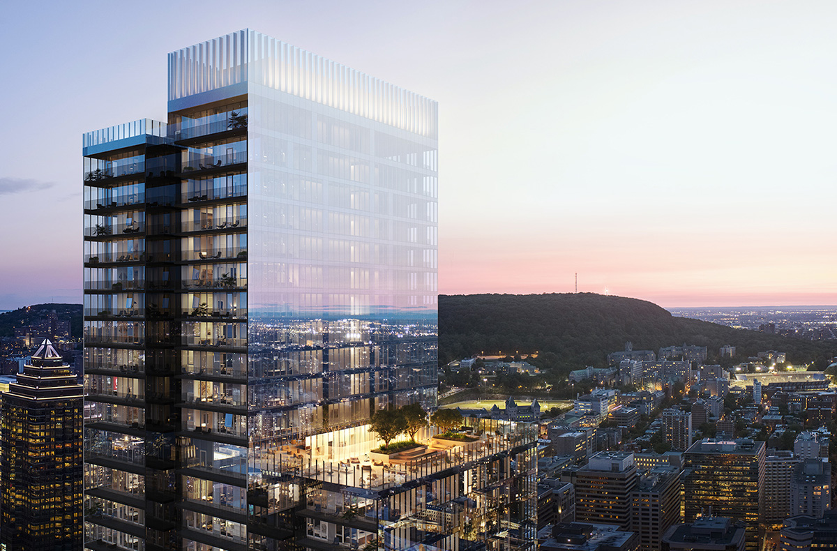 Au 51e étage de la tour résidentielle, une terrasse sera conçue pour offrir des vues panoramiques époustouflantes sur Montréal. Une autre terrasse, plus grande encore, située au 21e étage de la phase 2, sera aussi aménagée pour souligner les vues sur le Mont-Royal et la cour intérieure. Elle offrira des espaces communs pour les résidents souhaitant s’adonner au jardinage urbain et à la cuisine extérieure ou à la détente.