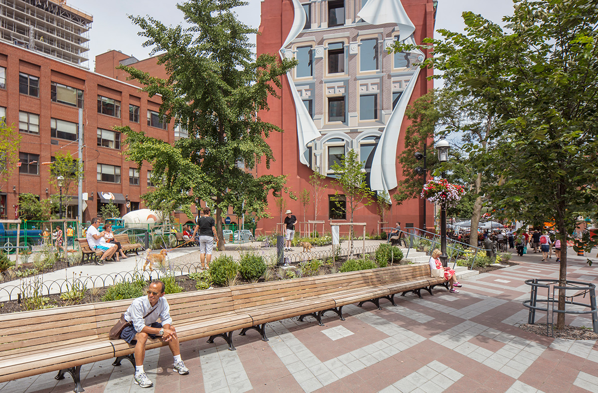 Photo, vue de la fontaine à Berczy Park pendant sa construction en 2016 - Claude Cormier + Associés