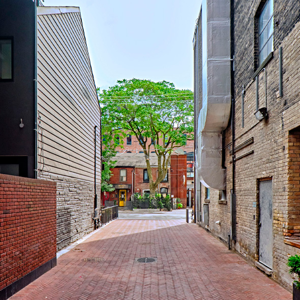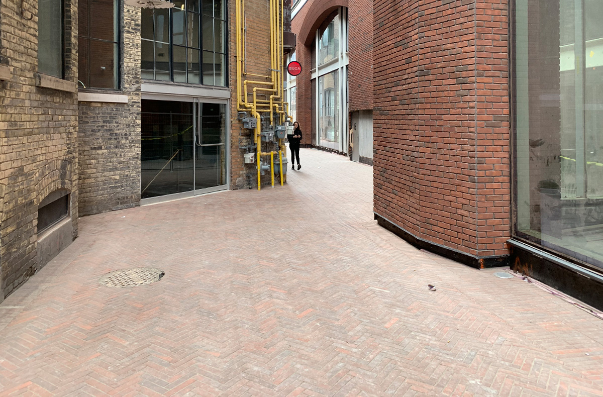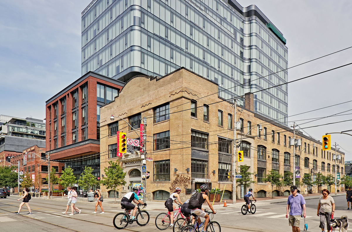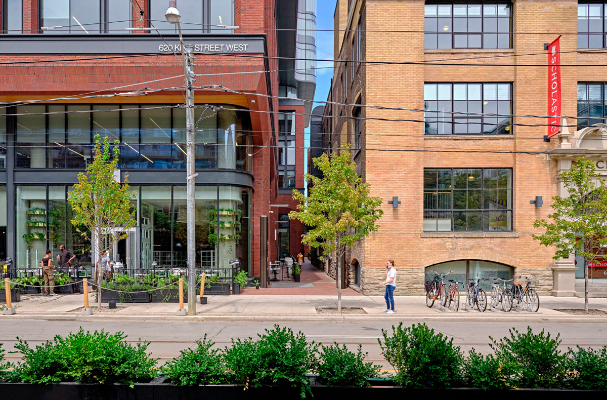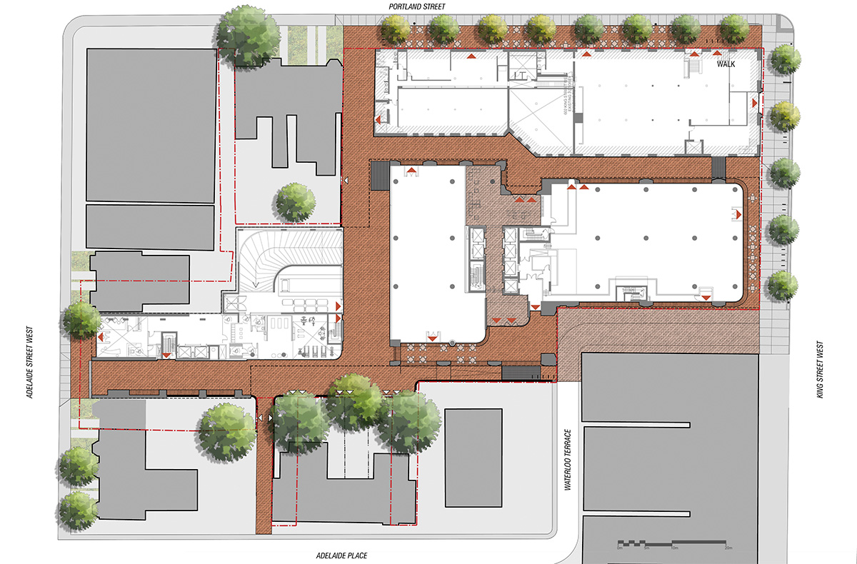Le King Portland Centre est un immeuble à usage mixte avec bureaux, commerces et condos dans le quartier King West de Toronto. Cette nouvelle insertion architecturale s’inscrit en accord avec l’échelle et la matérialité des propriétés historiques en brique de cette partie de la ville grâce à une disposition de ruelles piétonnes qui créent un réseau de circulation secondaire à travers le quartier. Résolument moderne avec des façades arrondies et d’imposants porte-à-faux, le bâtiment au fini en brique se poursuit sur le trottoir grâce à l’étendue de briques allongées en argile rouge disposées en chevron. Ces matériaux apportent une différenciation de texture qui souligne la priorité des piétons.