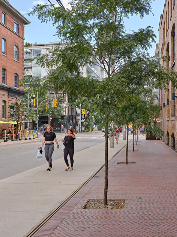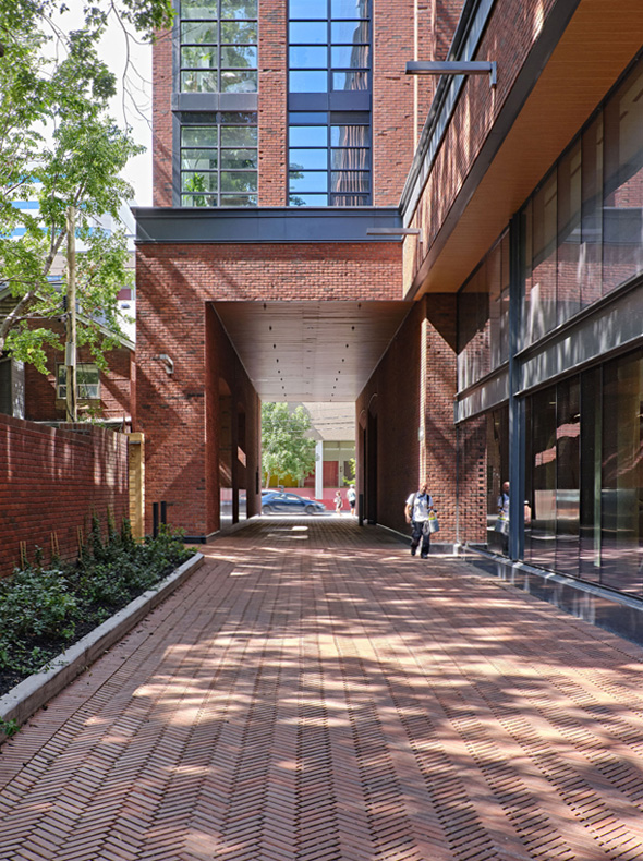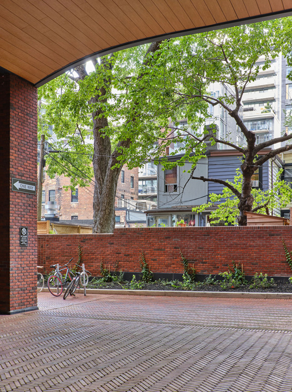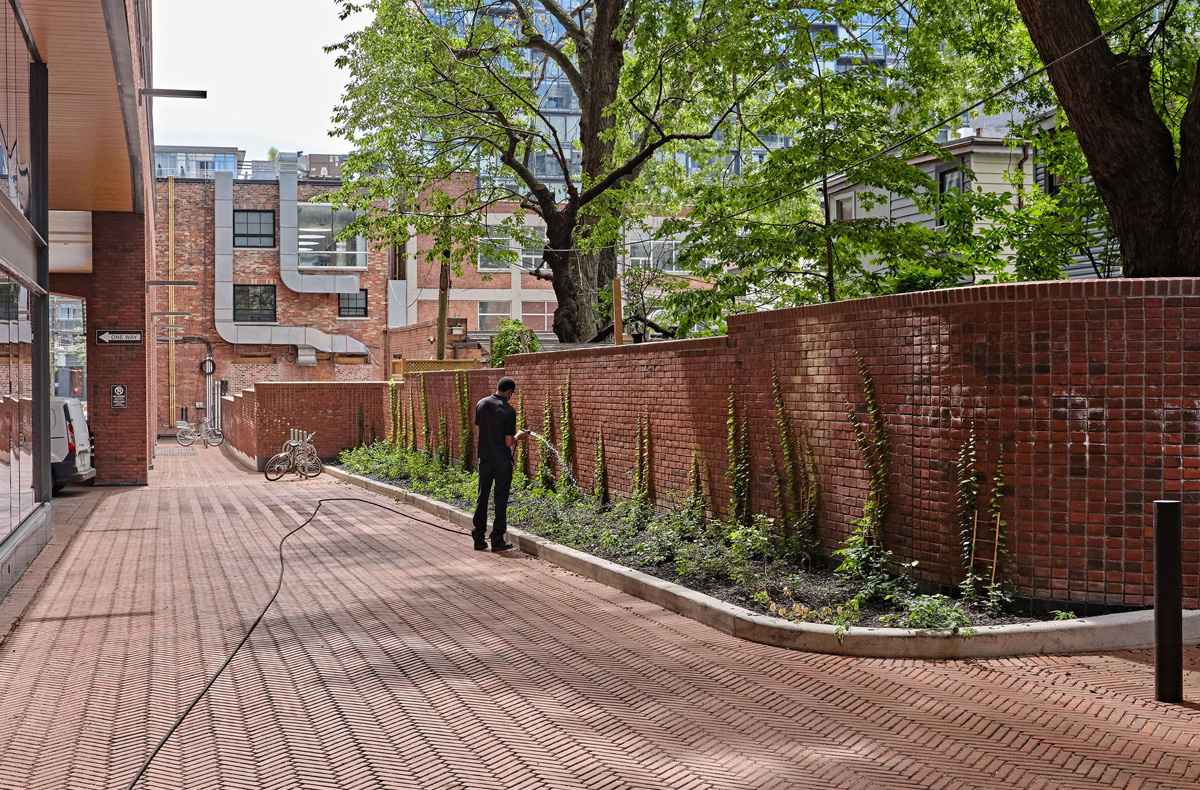 Un alignement d’arbres de rue plantés dans des volumes de sol continus et irrigués passivement par ruissellement, établissent un couvert végétal linéaire le long des rues King et Portland qui protège les abords du bâtiment de la rue et du soleil. Des murs en brique ornent les passages intérieurs et intègrent le projet avec les maisons historiques voisines, améliorant la richesse de l’espace piétonnier à travers cet îlot. Les pavés en briques se transforment discrètement en pavés perméables le long de l’axe de l’allée principale, sans interrompre la continuité du pavage à travers le site et les volumes du bâtiment.
