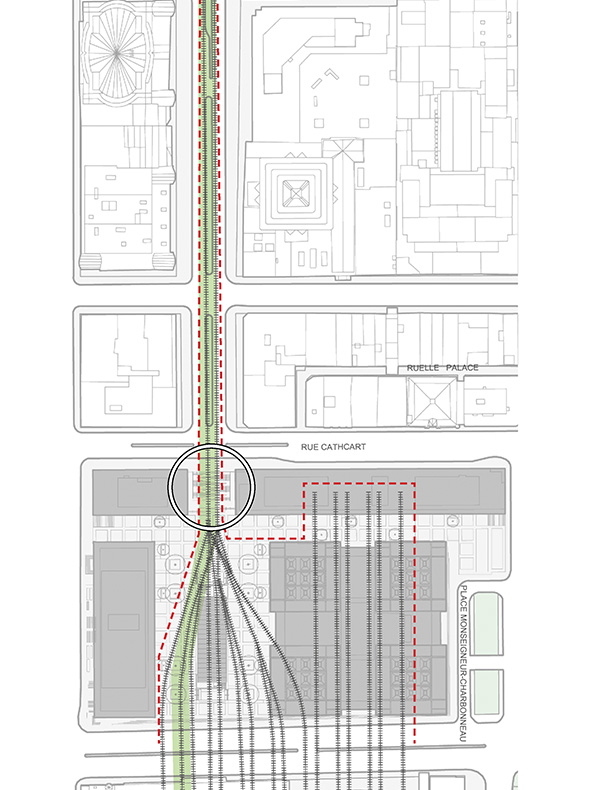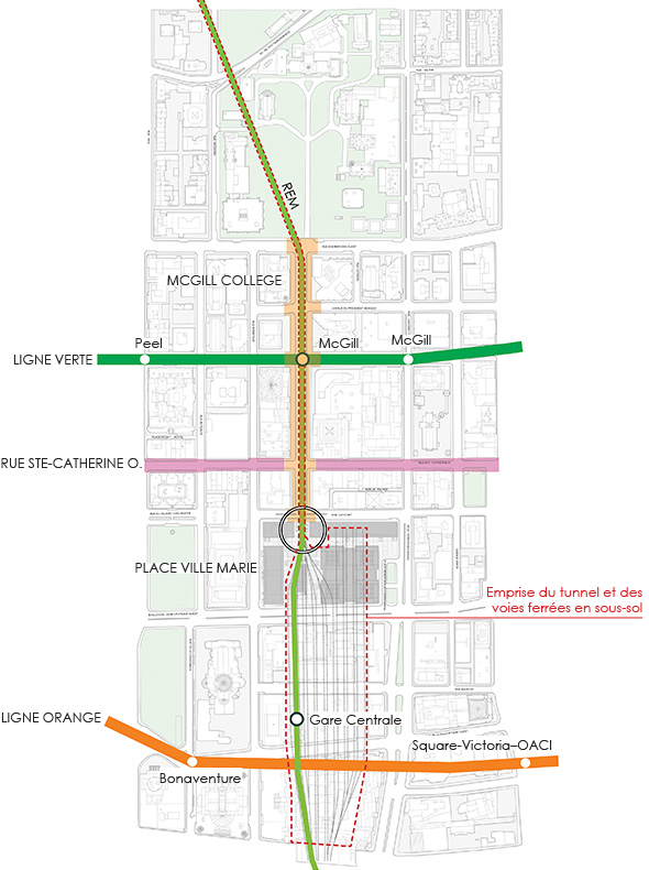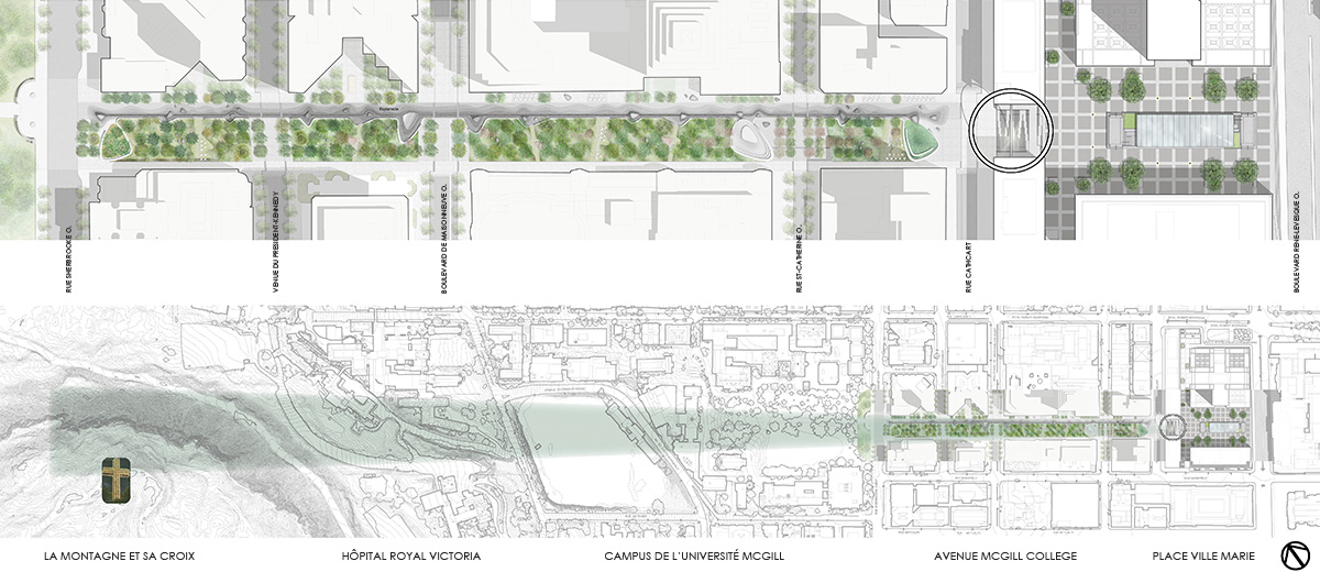 Plans contextuels - CCxA, à partir du plan original du projet Et Sillon réalisé par civiliti + Mandaworks et SNC Lavalin sur l'avenue McGill College pour la Ville de Montréal