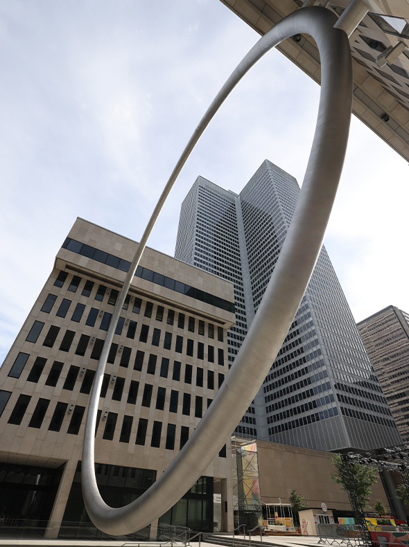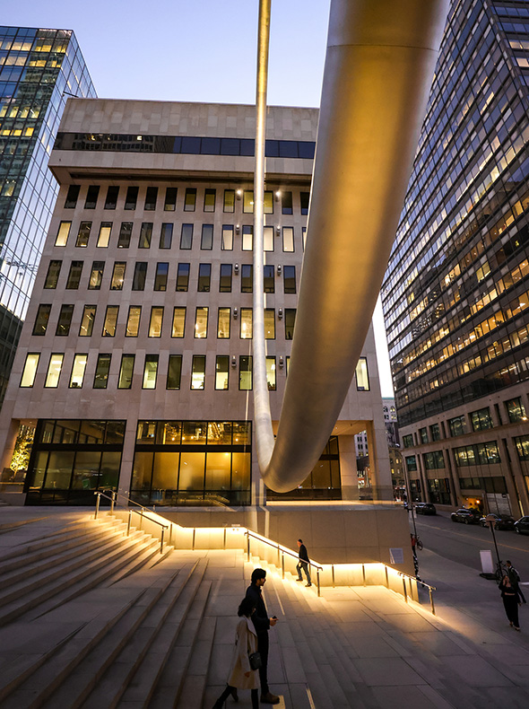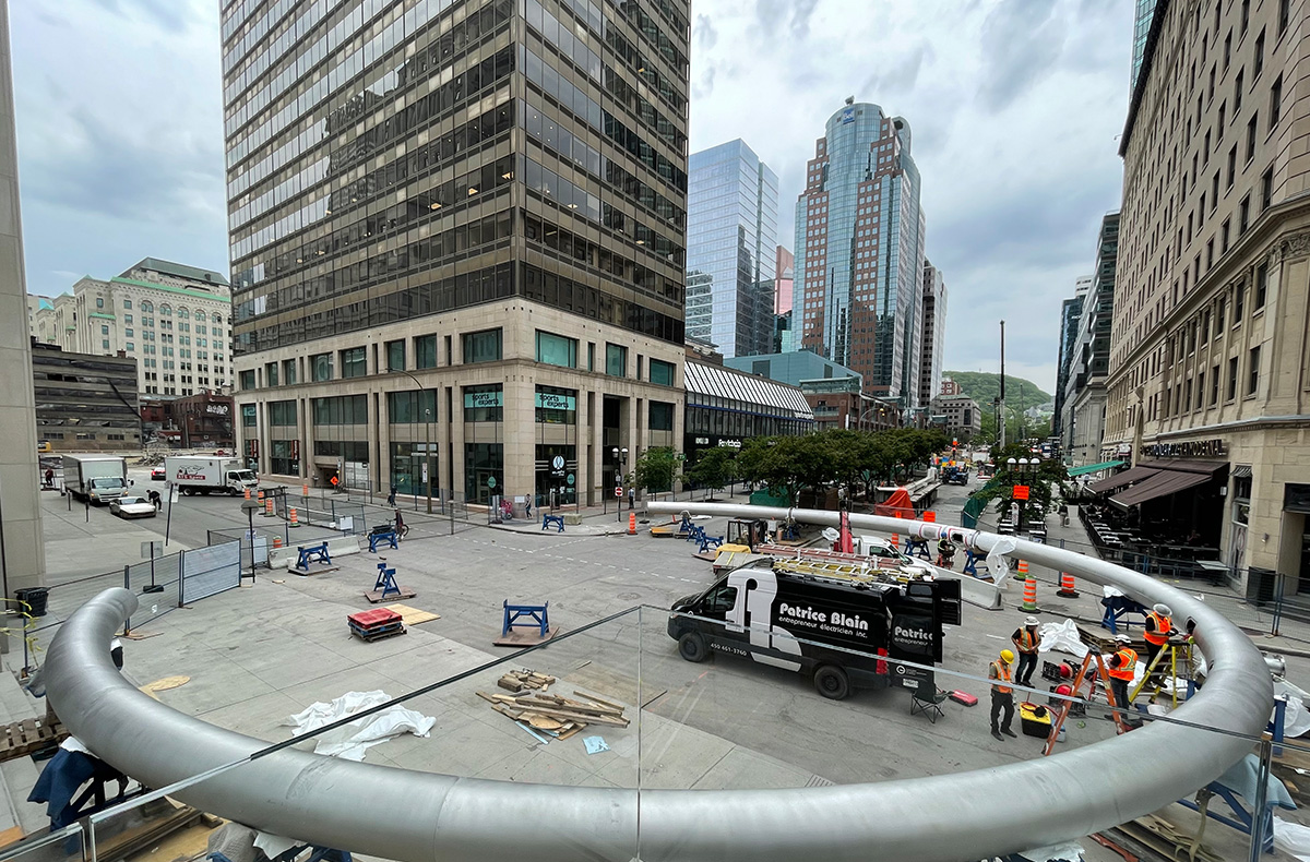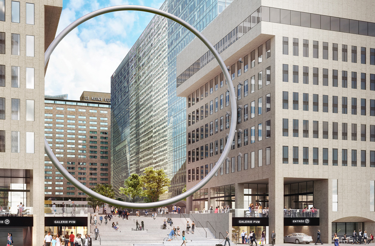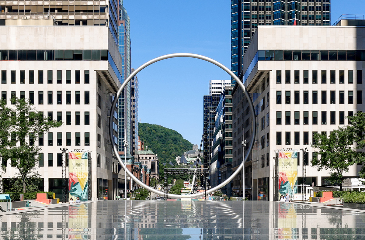 L’Anneau est une élégante oeuvre aérienne de 30 mètres de diamètre en acier inoxydable, « flottant » entre les tours 2/3 et 4 de Place Ville Marie, dans l’axe du mont Royal. Conçue dans le cadre du projet de Revitalisation de l’Esplanade PVM, elle participe à la reviviscence du centre-ville et du quartier des affaires.
