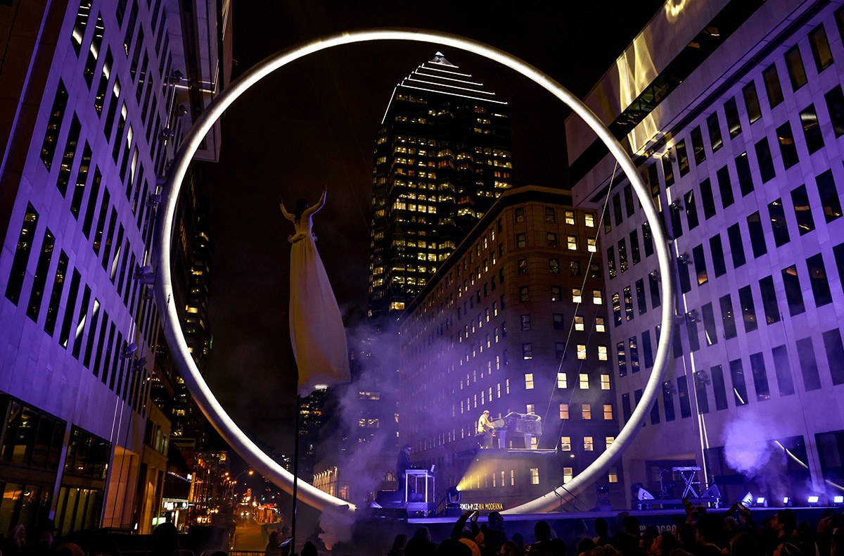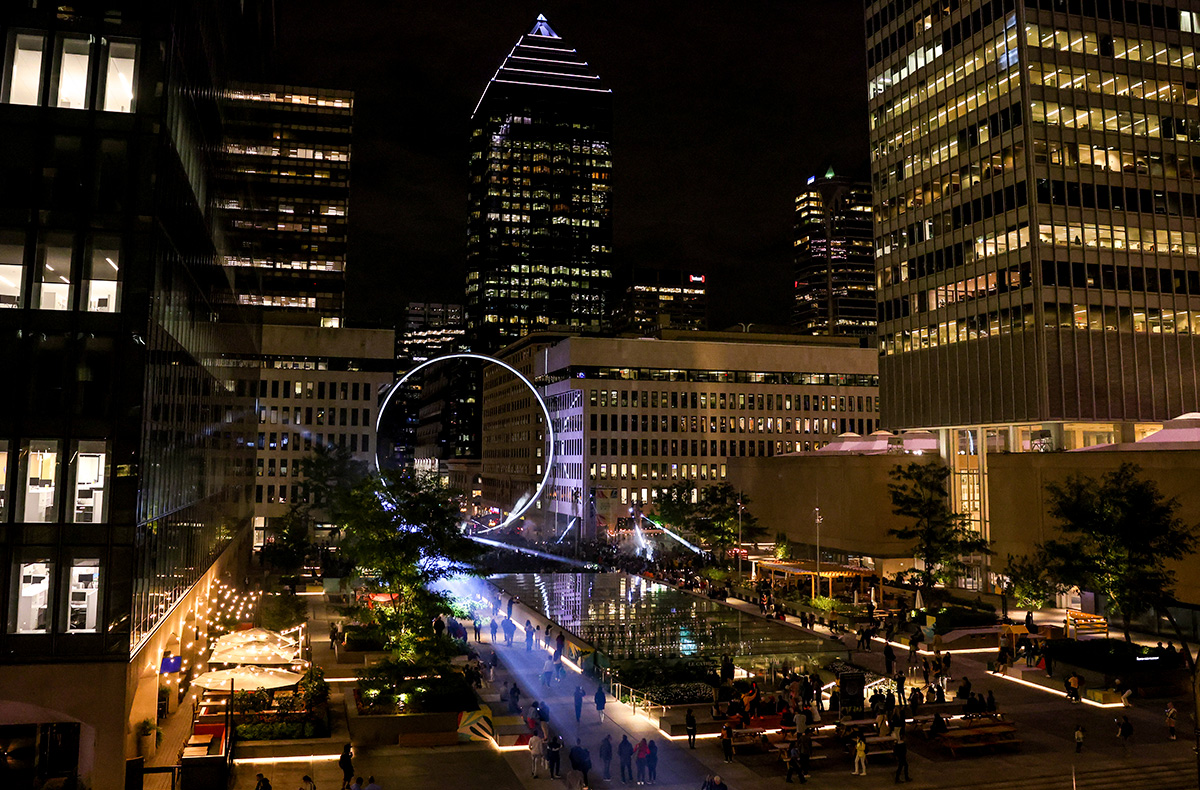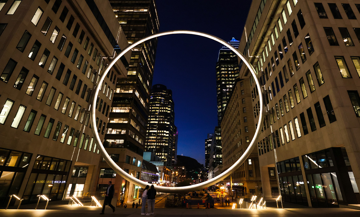 Éclairé en douceur afin de lui assurer une présence de jour comme nuit, L’Anneau dialogue avec la croix illuminée du mont Royal et les couronnements des édifices riverains. Cet effet de lune enrichit le ciel montréalais d’un symbole clair, franc, lisible.